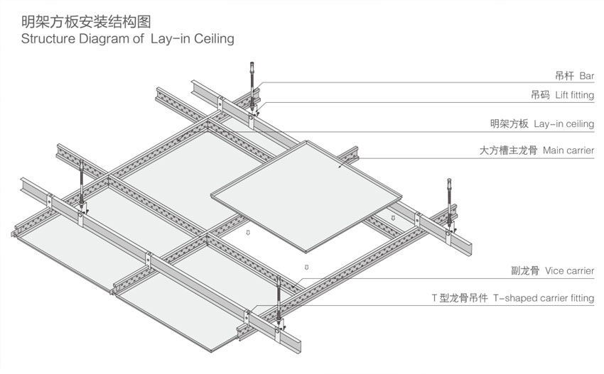 The ridged square ceiling contains three parts: the panel system the ridged carrier system, and the upper light steel carrier system The ridged square ceiling is with a smooth surface, distinct edges and lines. The whole ceiling is regular, graceful, elegant, and open White ridges make the ceiling surface uniform and integral The ridged square ceiling has many merits, for example, non combustible anticorrosion, dampproof and easy to dismantle. As every gusset plate can be installed and dismantled individually, it is very convenient to install, maintain, and clean.APPLICATION: