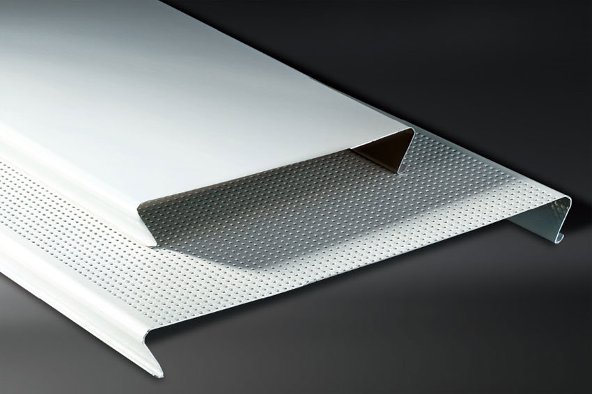 每塊板兩端可折邊,板與板兩端連接不需要任何裝飾便能很好地密拼在一起,同時(shí)可嵌入暗骨式條形方板做裝飾,解決了傳統(tǒng)條扣兩端不能折邊、連接收口裝飾難的問(wèn)題。