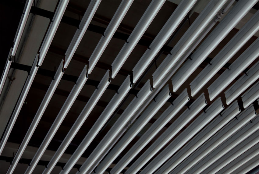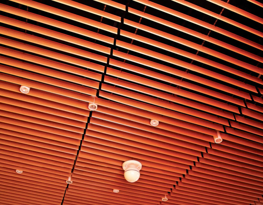 掛片天花采用單向條板安裝,形成單向屏級(jí)視覺;線條明快飄逸,選用適當(dāng)?shù)母叨龋赃m當(dāng)視覺角度,能產(chǎn)生幕布效果;其維修限制較少,令設(shè)計(jì)變化萬干,整個(gè)建筑空間寬暢通透。